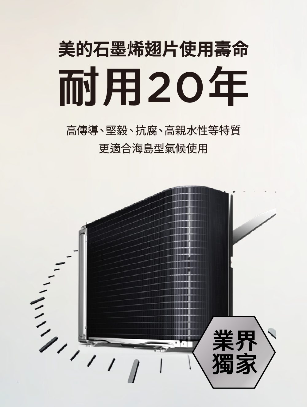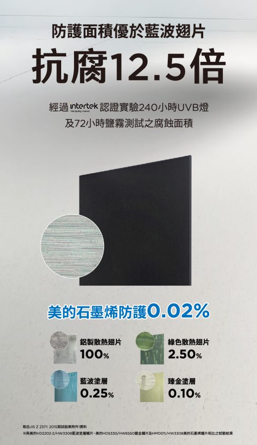 石墨烯這個名詞大家可能聽過,它不是單純「導熱好」而已,而是一種幾乎不受紫外線與酸鹼影響的超材料。Midea 將它應用在室外機散熱片上,並搭配黑鑽防護塗層,實測通過了: