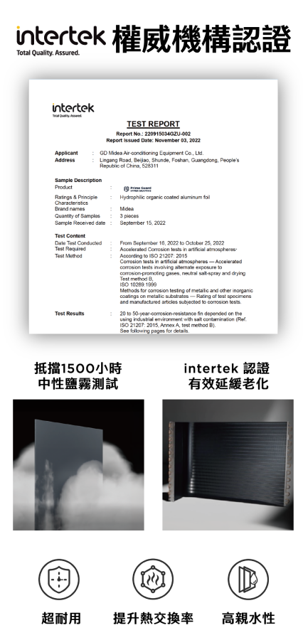 這些都不是廠商自賣自誇,而是 Intertek + ISO 國際標準雙認證。換句話說,即使你的冷氣是裝在陽台、頂樓、海邊,風吹日曬雨淋,它也能穩穩吹十年以上。