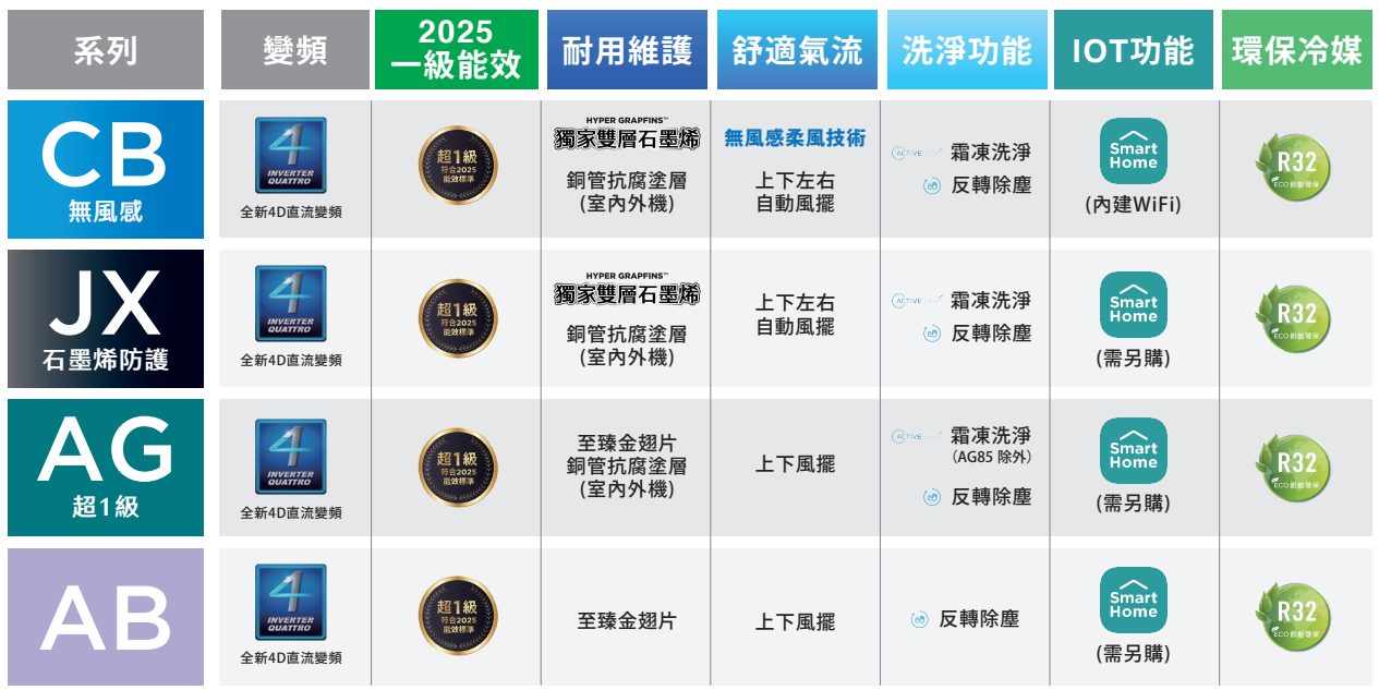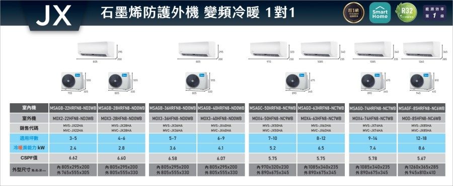 以上為美的空調 JX 系列適用坪數比較表,以及冷暖房能力、CSPF 值,各位可以依照自己空間的大小去挑選適合的機型。