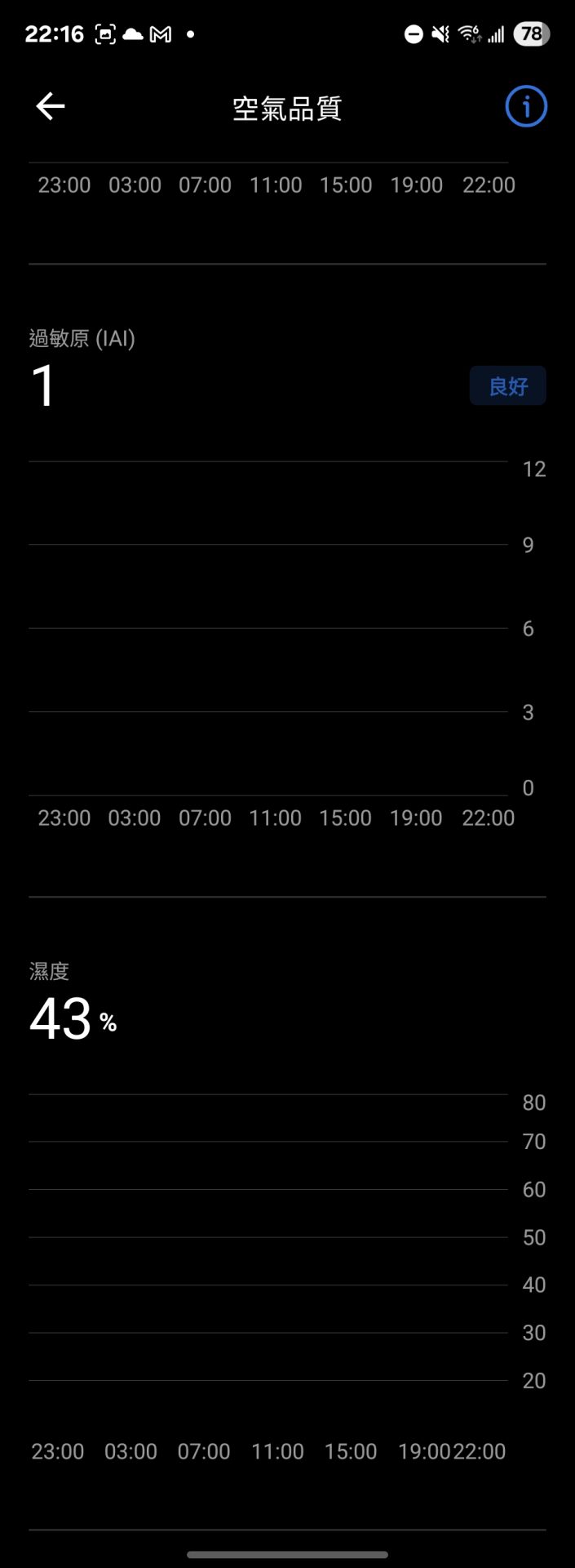 APP 的好處是,可以看到歷史空氣品質的紀錄,還有機器面板沒有一次顯示的數據,像是濕度、過敏原、氣體指數、溫度等,APP 中都可以一覽無遺。