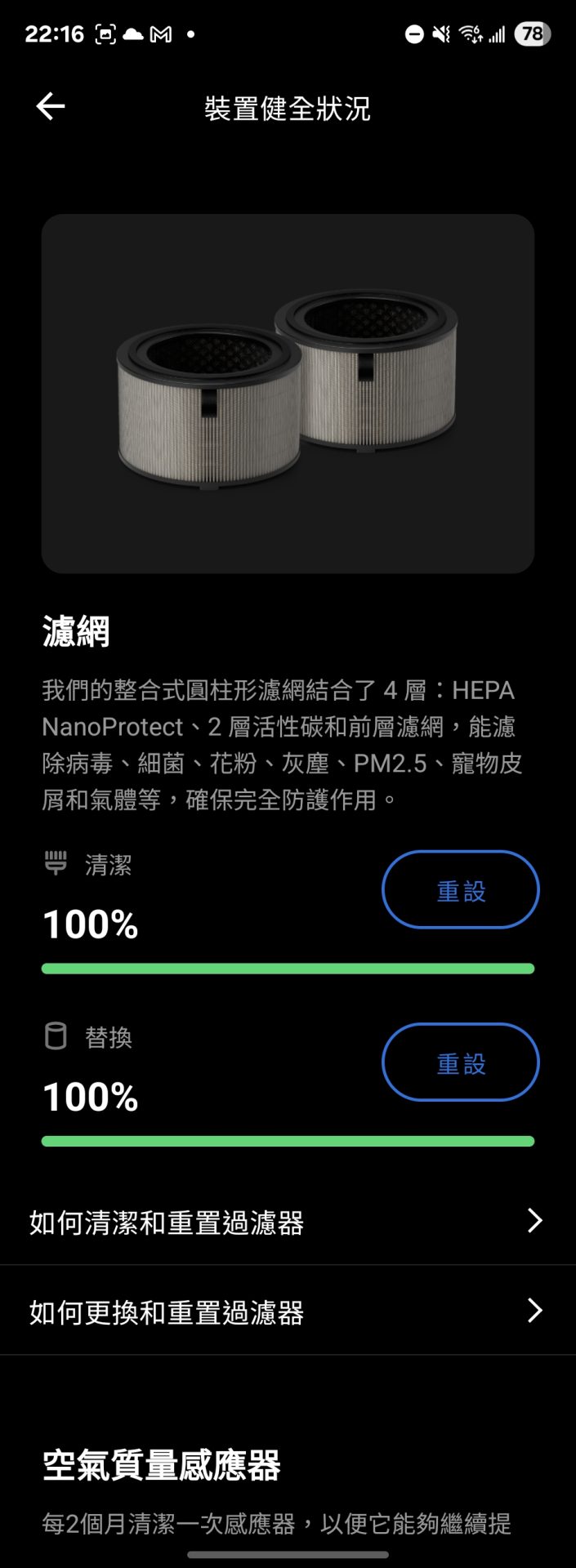 濾網壽命也可以在 APP 內查看,每兩個月建議清潔一次濾網,延長使用壽命。