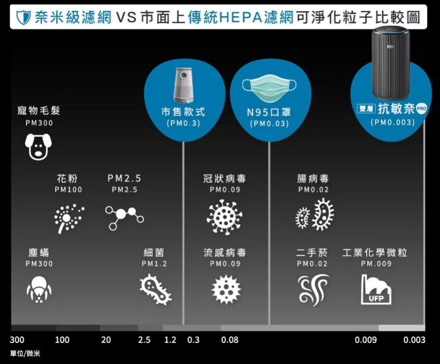 採用奈米級抗敏微護盾技術,四層奈米級HEPA濾網,最小可攔截 0.003 μm,不論灰塵、毛髮、黴菌、塵蟎、花粉、細菌、病毒、油煙、異味、TVOC、工業化學微粒等等,通通一網打盡,比 N95 口罩還強大!